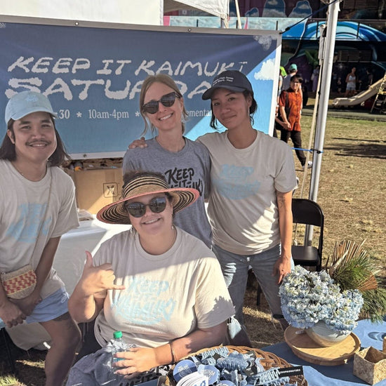 - Short sleeve beige tee with denim blue KIK logo on front and back.
